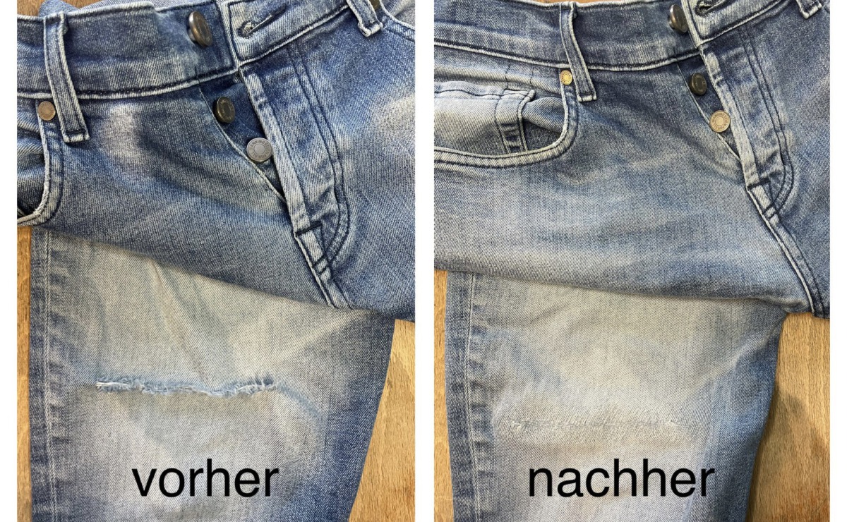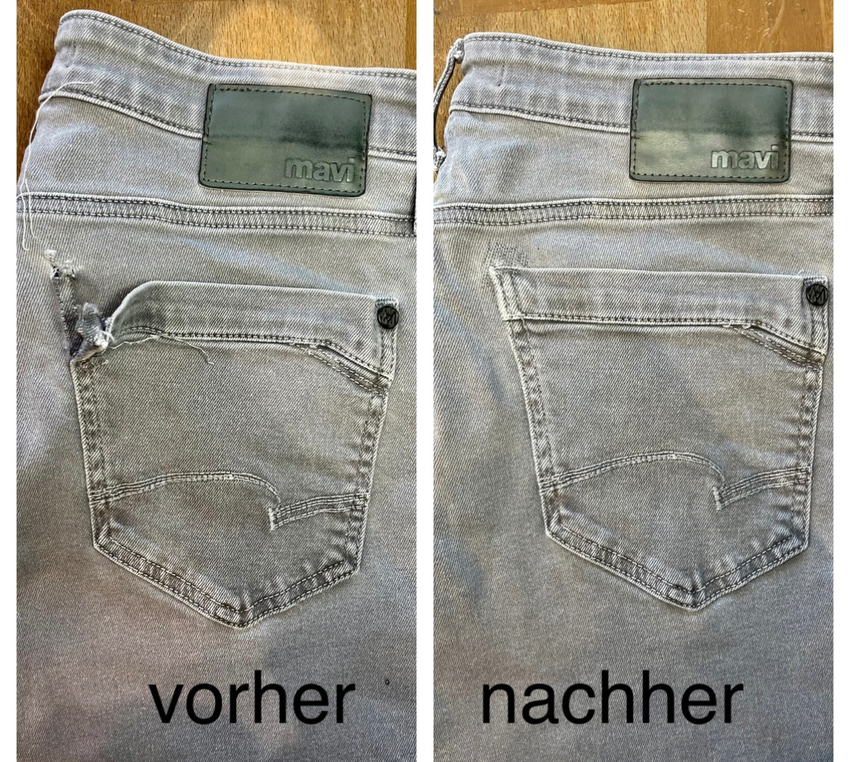 Hier ist die Reperatur eines Taschenrisses abgebildet. Jeansstoffe werden mit Hilfe der Nähmaschine gestopft.