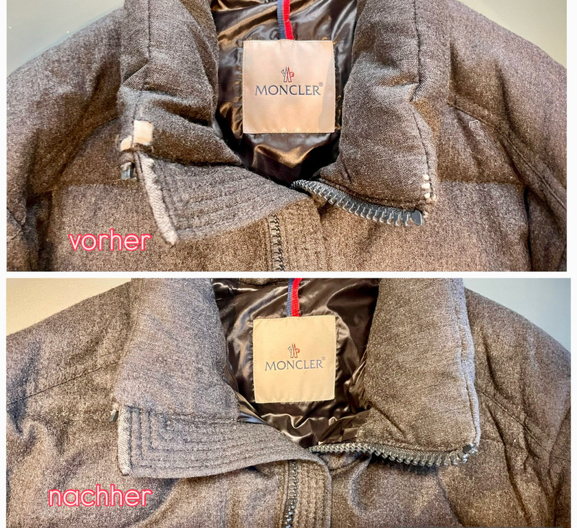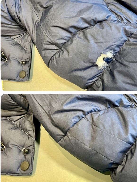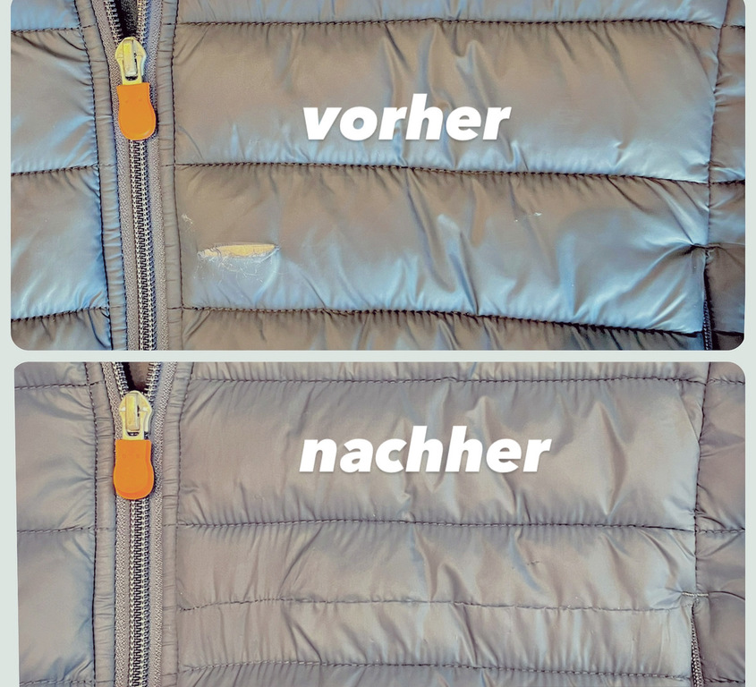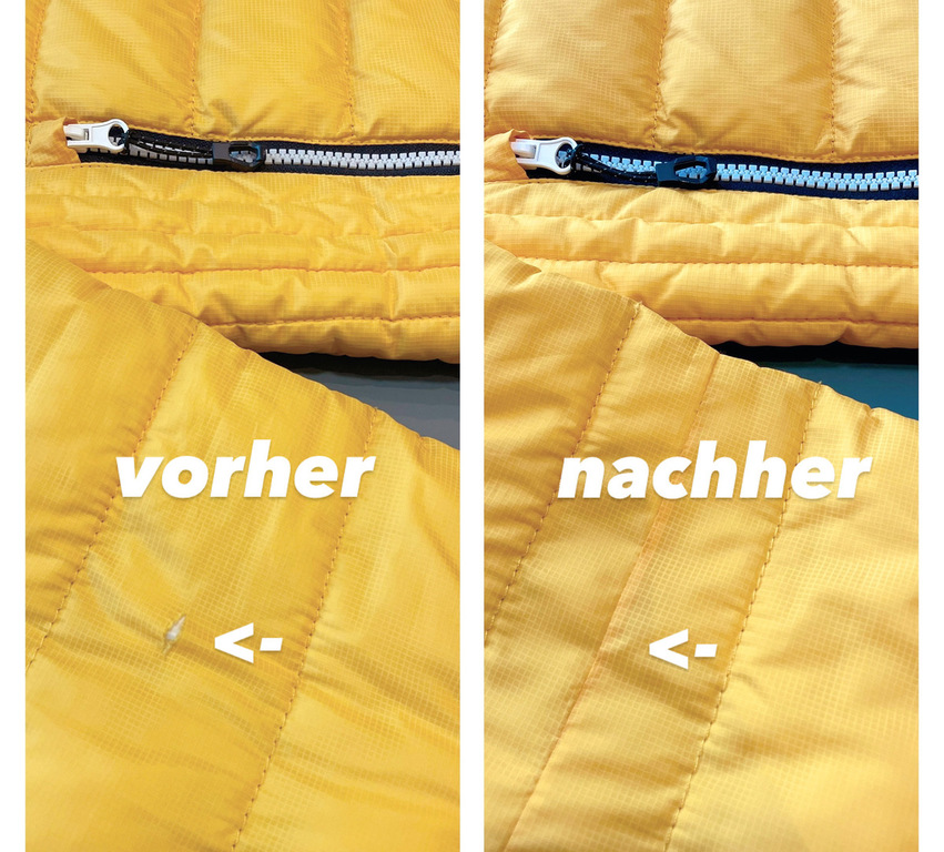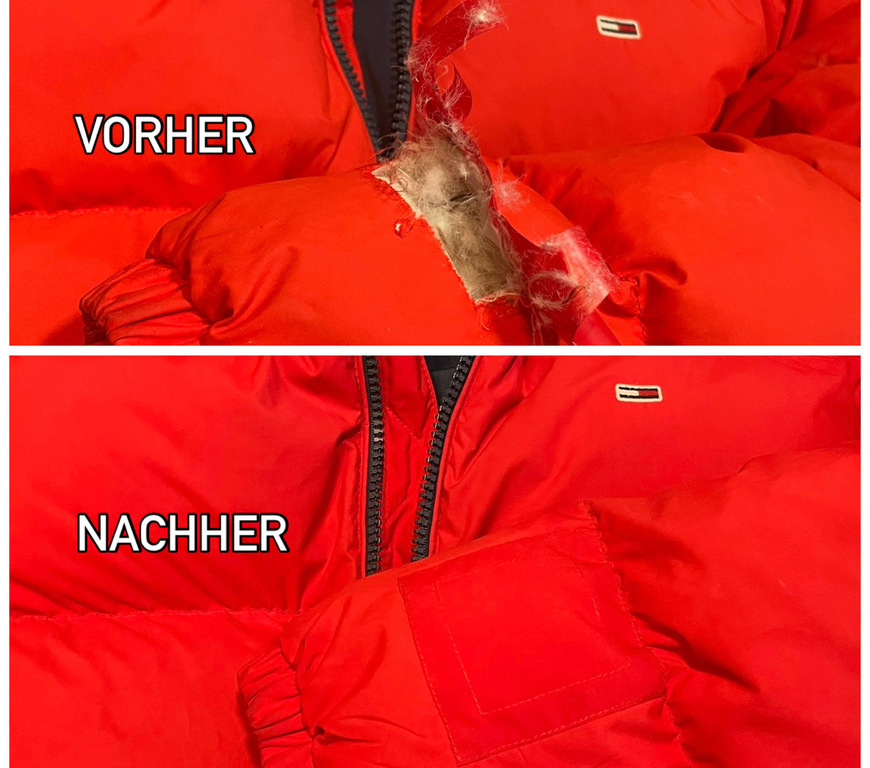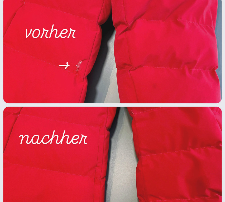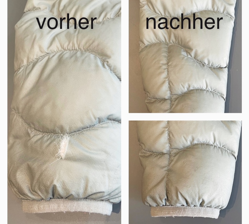 Hier wurden unterschiedliche Risse in Daunenjacken mittels Ziernähten verschlossen.